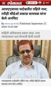 आयएएसच्या पदोन्नतीत प्रथम क्रमांकाचे नाव असतानाही अनफिट दाखवून जिल्हा परिषदेचे माजी मुख्य कार्यकारी अधिकारी प्रकाश वायचळ यांना डावलले असल्याचे माहितीच्या अधिकारात उघड झाले होते. या अन्यायाबाबत वायचळ यांनी उच्च न्यायालयात धाव घेतली होती. सप्टेंबर 2020 च्या पहिल्या आठवड्यात केंद्र शासनाने राज्यातील २३ अधिकाºयांची आयएएसच्या दर्जावर पदोन्नती केली. १ जानेवारी ते ३१ डिसेंबर २0१८ या कालावधीत रिक्त झालेल्या भारतीय प्रशासन सेवा (महाराष्ट्र राज्य संवर्ग) या पदावर या अधिक़ाºयांची पदोन्नतीने निवड केल्याचे भारत सरकारच्या कार्मिक व प्रशिक्षण विभागाच्या अवर सचिवांनी जाहीर केले. यादीत नाव न आल्याने वायचळ यांनी महाराष्ट्र शासनाच्या महसूल व वन विभागाच्या अप्पर मुख्य सचिवांकडे पत्राद्वारे विचारणा केली होती. पण तोवर गोवर्धन दिकोंडा व रामचद्र उबाळे यांनी माहितीच्या अधिकारात या पदोन्नती कशा झाल्या याची युनियन पब्लिक सर्व्हिस कमिशनकडे माहिती मागितली. १४ सप्टेंबर रोजी युपीसीचे सचिव जी. सी. शहा यांनी दिलेल्या माहितीमध्ये धक्कादायक बाब उघड झाली होती. महाराष्ट्र शासनाने शिफारस केलेल्या नावांमधून समितीचे अध्यक्ष भारत व्यास यांच्या चार सदस्यीय समितीने ७ आॅगस्ट रोजी बैठक घेऊन पदोन्नतीचे नावे अंतिम केली. या समितीकडे आलेल्या नावांमध्ये पहिले नाव सोलापूर झेडपीचे माजी मुख्य कार्यकारी अधिकारी प्रकाश वायचळ यांचे होते. त्यांच्या नावापुढे अनफिट असा शेरा मारून पदोन्नती नाकारण्यात आल्याचे स्पष्ट झाले होते. उच्च न्यायालयात या प्रकरणावर सुनावणी होऊन वायचळ यांच्यावर अन्याय झाल्याचे स्पष्ट झाल्यावर न्यायालयाने त्यांच्या बाजूने निकाल दिला. वायचळ यांना 2020 च्या यादीतील आयएएस ग्राह्य धरण्यात आले होते. त्यानंतर महाराष्ट्र शासनाने त्यांच्या केलेल्या सेवेचे परीक्षण करून अहवाल सादर केल्यावर भारतीय प्रशासक सेवेने त्यांना 1994 चे आयएएस अधिकारी म्हणून पदोन्नती मान्य केली आहे. ते निवृत्त झाले असले तरी न्यायालयाच्या निकालाप्रमाणे त्यांना या पदावर पुन्हा संधी देण्यात येणार आहे. ‘लोकमत” या वृत्तपत्रात त्यांच्यावर अन्याय झाल्याची प्रसिद्ध झालेल्या बातमीची न्यायालयाने दखल घेतली हे येथे उल्लेखनीय.