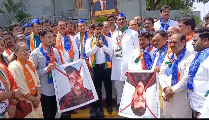 महामानव डॉ. बाबासाहेब आंबेडकर यांचा अवमान करणाऱ्या जितेंद्र आव्हाड यांचा निषेध असो, भारतरत्न डॉ. बाबासाहेब आंबेडकर यांचा विजय असो, जितेंद्र आव्हाडांवर कारवाई झालीच पाहिजे, आदी घोषणा याप्रसंगी देण्यात आल्या.माजी पालकमंत्री आमदार विजयकुमार देशमुख म्हणाले, ज्या भारतरत्न डॉ. बाबासाहेब आंबेडकर यांनी समाजातील दबलेल्या, पिचलेल्या, उपेक्षितांना न्याय, अधिकार मिळवून दिला. त्या डॉ. बाबासाहेब आंबेडकर यांची प्रतिमा फाडण्याचे कृत्य जितेंद्र आव्हाड यांनी केले आहे. त्याबद्दल त्यांना तत्काळ अटक करून कारवाई करावी.