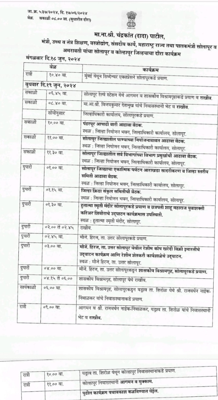 सोलापूर : लोकसभेच्या निकालानंतर सोलापूरकडे पाठ फिरवलेल्या पालकमंत्री चंद्रकांत पाटील यांनी अखेर सोलापूरचा दौरा जाहीर केला आहे.