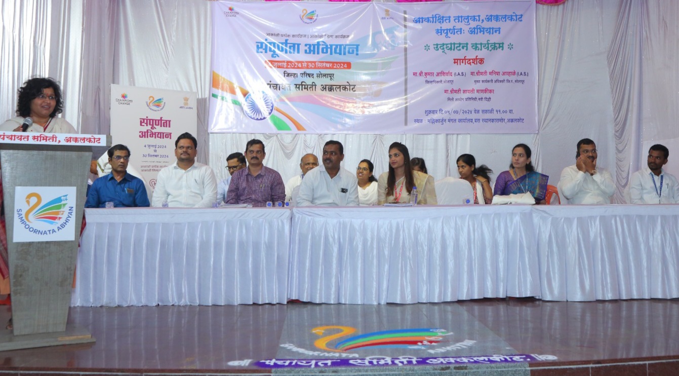 सोलापूर : पंचायत समिती अक्कलकोट यांच्यावतीने आकांक्षित तालुका अक्कलकोट येथे नीती आयोगाच्या माध्यमातून जिल्हाधिकारी कुमार आशीर्वाद व जिल्हा परिषदेच्या मुख्य कार्यकारी अधिकारी मनिषा आव्हाळे यांच्या मार्गदर्शनाखाली 4 जुलै ते 30सप्टेंबर या कालावधीत सुरू झालेल्या संपूर्णता अभियानाचे उद्घाटन शुक्रवारी सातशे ते आठशे लोकांच्या उपस्थितीत आणि नीती आयोगाच्या प्रतिनिधी श्रीमती सायली माणकिकर यांच्या उपस्थितीत पार पडला.