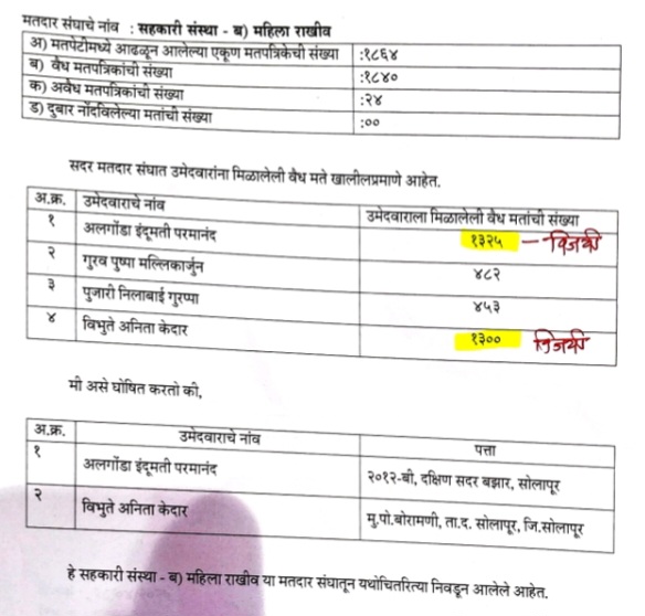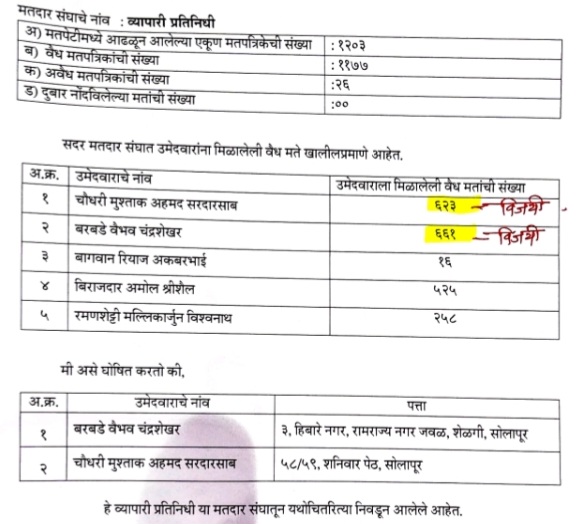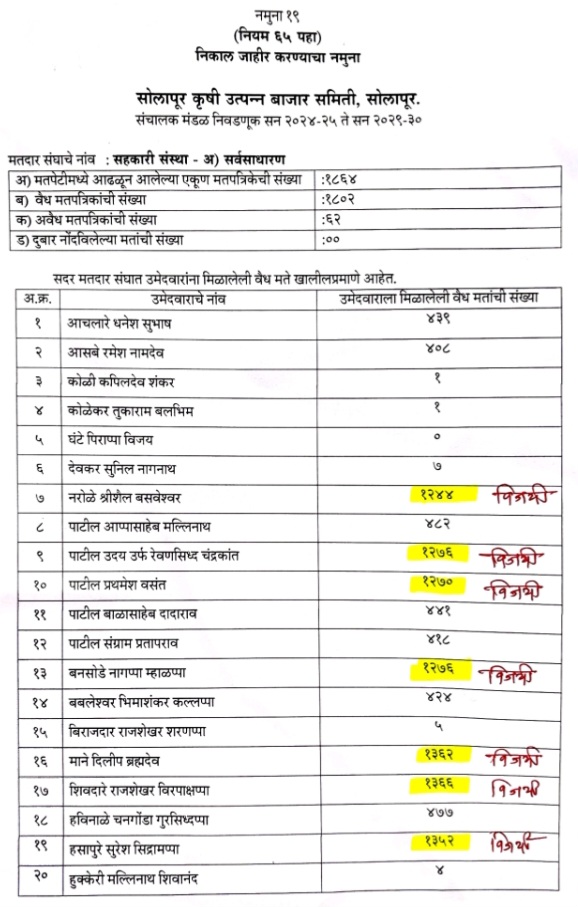 कृषी उत्पन्न बाजार समितीच्या निवडणुकीत कल्याणशेट्टी, माने, हसापुरे गटाच्या सिद्धेश्वर शेतकरी विकास पॅनलचे विजयी झालेले उमेदवार पुढील प्रमाणे आहेत. सोसायटी मतदारसंघ: दिलीप माने, सुरेश हसापुरे, राजशेखर शिवदारे, श्रीशैल नरोळे, प्रथमेश पाटील, उदय पाटील, नागन्ना बनसोडे, इंदुमती अलगोंडा, अनिता विभुते अविनाश मार्तंडे, सुभाष पाटोळे, सुनील कळके. हमाल- तोलार : गफार चंदा, व्यापारी: मुस्ताक चौधरी, वैभव बरबडे.