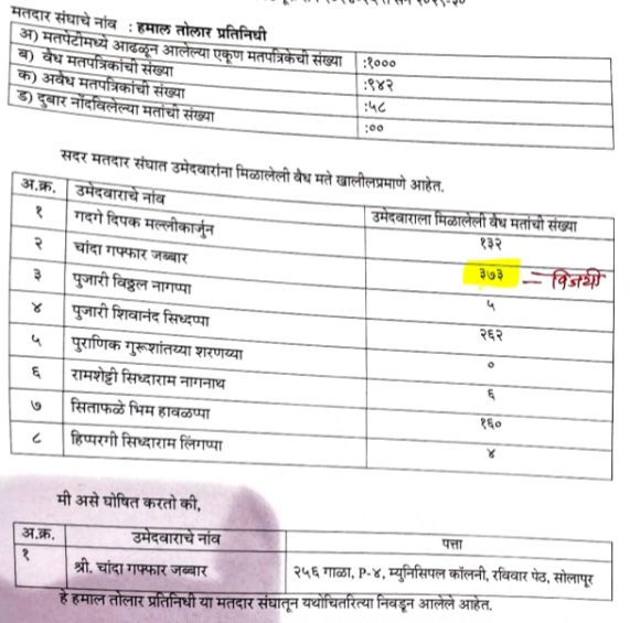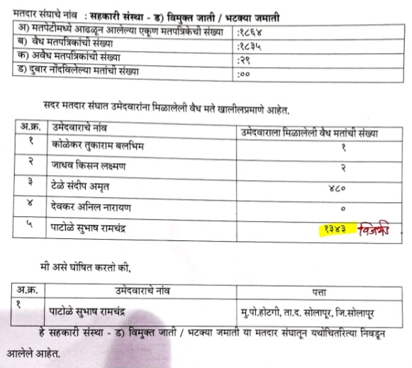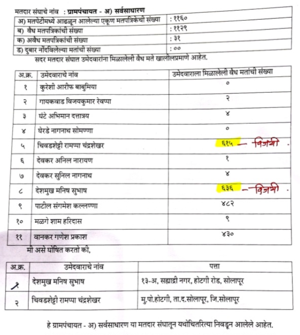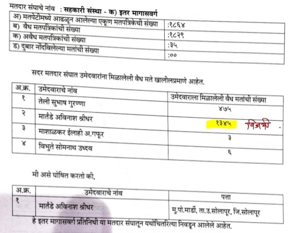 ग्रामपंचायत विभागात आमदार सुभाष देशमुख, आमदार विजयकुमार देशमुख यांच्या गटाचे तिन्ही उमेदवार विजयी झाले. यात आमदार सुभाष देशमुख यांचे चिरंजीव मनीष देशमुख रामाप्पा चिवडशेट्टी, अतुल गायकवाड यांचा समावेश आहे. सिद्धेश्वर परिवर्तन पॅनलच्या माध्यमातून निकराची झुंज दिली पण सोसायटी मतदार संघात या गटाला शिरकाव करता. या गटाच्या बाजूने माजी आमदार सिद्धाराम म्हेत्रे, बळीराम साठे, बाळासाहेब शेळके, रमेश पाटील, महादेव चाकोते यांचीही मदत झाली. सोसायटी मतदारसंघात माजी आमदार दिलीप माने व माजी संचालक सुरेश हसापुरे यांचे वर्चस्व आहे. या निवडणुकीतही हे वर्चस्व कायम असल्याचे दिसून आले. भाजपचे कल्याणशेट्टी व माजी आमदार दिलीप माने यांना सोबत घेऊन बाजार समितीची निवडणूक यशस्वी करण्याची सुरेश हसापुरे यांची रणनीती यशस्वी ठरली आहे. सिद्धेश्वर शेतकरी पॅनलने बहुमत मिळवल्यावर कल्याणशेट्टी, माने व हसापुरे यांच्या कार्यकर्त्यांनी जल्लोष केला.त्यामुळे आता सभापतीपदी माजी आमदार दिलीप माने व उपसभापतीपती सुरेश हसापुरे यांचे नाव निश्चित असल्याची कार्यकर्त्यांमध्ये चर्चा आहे.