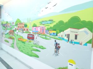 सभागृहात पोर्चमध्ये सर्वात लक्षवेधी काम झाले आहे. पोर्चच्या दोन्ही भिंतीवर आकर्षक चित्रे रेखाटण्यात आली आहेत. अजून हे काम सुरु आहे. सभागृहाकडे जात असताना पोर्चच्या डाव्या बाजूला पंढरीच्या वाटेवर असलेले पताका घेतलेले वारकरी समोर दिसतात. त्यानंतर नंदीध्वज घेऊन निघालेल्या सिद्धेश्वर भक्तांचे दर्शन होते. उजव्या बाजूला गावातील बसस्थानक, सायकलवरून शाळेकडे निघालेला विद्यार्थी, गावातील बाजारपेठ, पाणीपुरवठा करणारी टाकी, हिरवी झाडे व वरून फिरणारे पक्षी असे समृद्ध गावाचे चित्रीकरण दिसते. प्रवेशद्वारावरील या दोन्ही भिंतीवरून जिल्हा परिषदेचे विकासात्मक दृष्टी सर्वांच्या नजरेत भरते. मुख्य कार्यकारी अधिकारी कुलदीप जंगम यांच्या संकल्पनेतून ही चित्रे साकारण्यात आली आहेत. आणखी काही थोडी कामे शिल्लक आहेत. त्यानंतर ग्रामविकास मंत्री तथा जिल्ह्याचे पालकमंत्री जयकुमार गोरे यांच्याहस्ते या नूतनीकरण कामाचे उद्घाटन करण्याचे नियोजन करण्यात येत मुख्य कार्यकारी अधिकारी कुलदीप जंगम यांनी सांगितले.