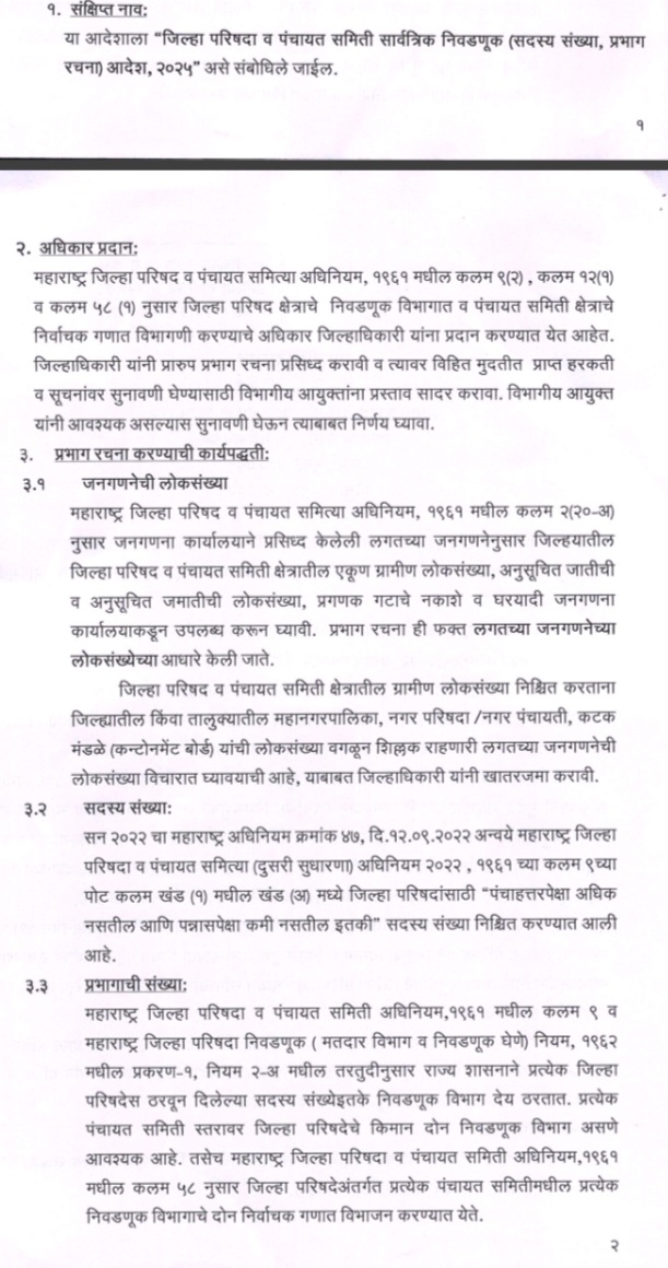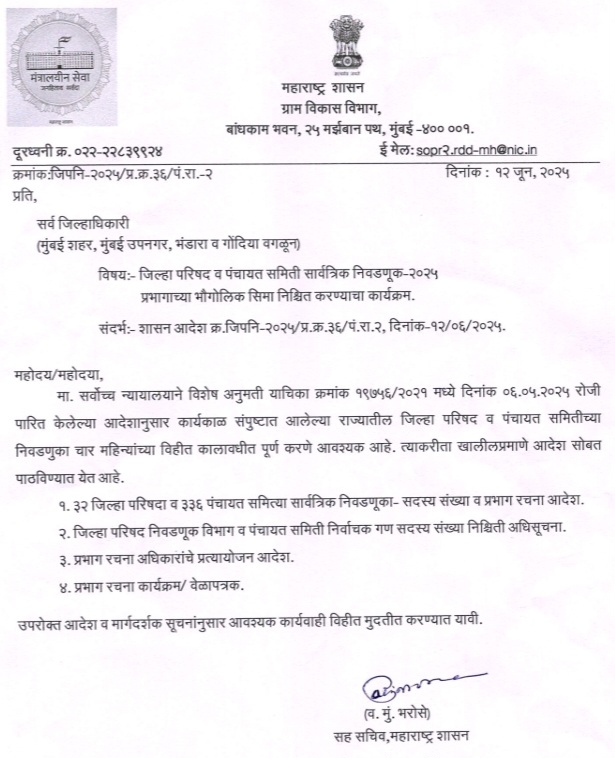 सोलापूर : सर्वोच्च न्यायालयाच्या आदेशाप्रमाणे जिल्हा परिषद व पंचायत समितीच्या निवडणुका चार महिन्यात घेण्यात येणार असल्याने सर्व जिल्हाधिकाऱ्यांनी झेडपी व पंचायत समितीच्या सदस्य व प्रभाग रचना निश्चित करण्याचा कार्यक्रम जाहीर करावा, असे आदेश महाराष्ट्र शासनाचे उपसचिव व्ही एम भरोसे यांनी गुरुवार दि. 12 रोजी दिले आहेत. त्यामुळे भावी झेडपी मेंबरनो. लागा कामाला, आता वेळ कमी आहे.