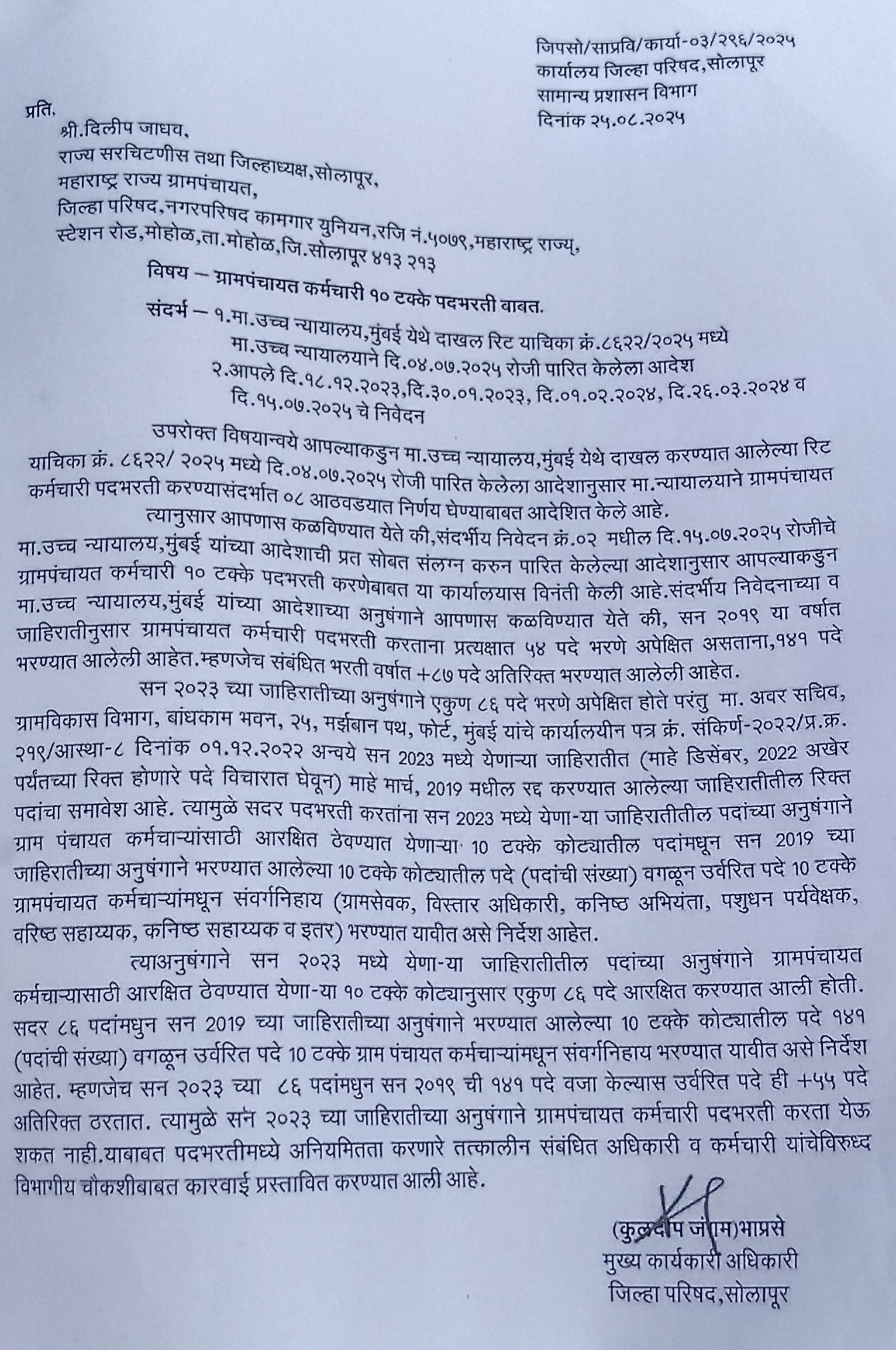 सोलापूर जिल्हा परिषद अंतर्गत 2023 च्या जाहिरातीच्या अनुषंगाने ग्रामपंचायत कर्मचारी यांच्या दहा टक्के कोटा राखीव मधील 86 पदे व सन 2019 च्या जाहिरातीवरून 55 पदे जास्त भरती झाल्याचे दिशाभूल करणारे कारण सांगून ग्रामपंचायत कर्मचाऱ्यांच्या दहा टक्के भरतीला ब्रेक लावल्याबद्दल महाराष्ट्र राज्य ग्रामपंचायत जिल्हा परिषद नगर परिषद कामगार युनियनने मुंबई उच्च न्यायालयात धाव घेतली होती. मुंबई उच्च न्यायालयाचे न्यायमूर्ती एम. एस. कर्णिक व एन. बी. बोरकर यांच्या खंडपीठाने चार जुलै रोजी निर्णय देत सोलापूर जिल्हा परिषदेने याबाबत आठ आठवड्यात निर्णय घ्यावा असे निर्देश दिले होते. त्यानुसार मुंबई उच्च न्यायालयाचा आदेश व संघटनेचे पत्र प्राप्त होतात जिल्हा परिषदेचे मुख्य कार्यकारी अधिकारी कुलदीप जंगम यांनी 25 ऑगस्ट रोजी संघटनेला जिल्हा परिषदेच्या ग्रामपंचायत कोट्यातील दहा टक्के भरतीबाबत वस्तुस्थिती निहाय खुलासा केला आहे. यापूर्वीच्या पदभरतीत गडबड झाल्याचे त्यांनी संघटनेला कळविले आहे. त्यामुळे जिल्हा परिषद दिशाभूल करीत असल्याचा संघटनेचा आरोप फोल ठरला आहे.