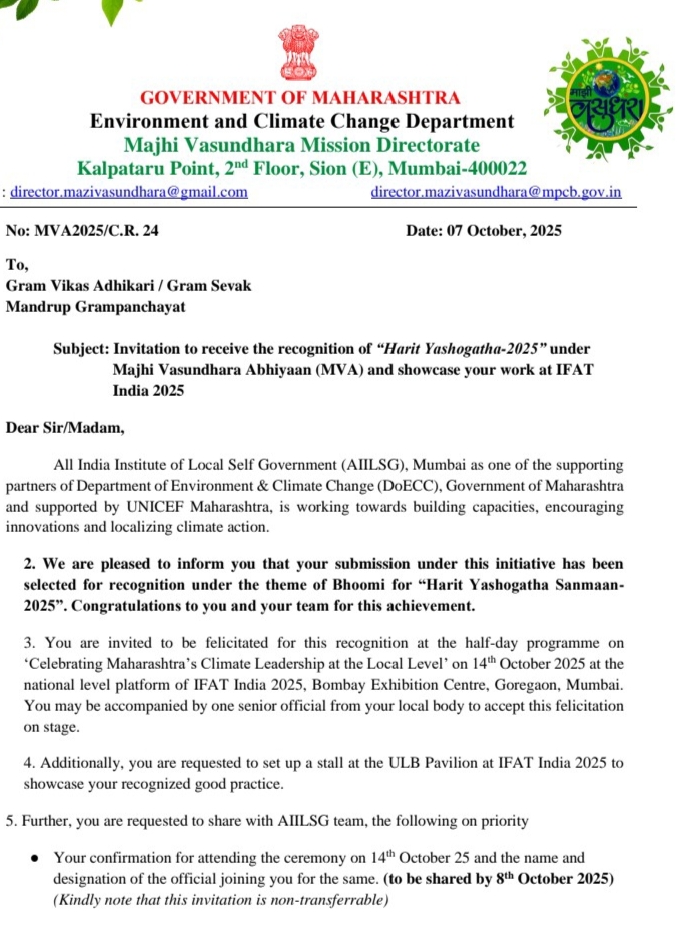 माझी वसुंधरा उपक्रमाअंतर्गत युनिसेफच्या मदतीने राज्यभरात पर्यावरण पूरक उपक्रम राबविलेल्या ग्रामपंचायती व संस्थांचा सन्मान केला जातो. महाराष्ट्र शासनाच्या माजी वसुंधरा उपक्रमात मंद्रूप ग्रामपंचायतीने यापूर्वी राज्यात प्रथम क्रमांक पटकावला आहे. या पुरस्काराची दखल घेत हरित यशोगाथा सन्मान 2025 या कार्यक्रमात ही मंद्रूप ग्रामपंचायतचा सन्मान करण्यात येणार असल्याचे जाहीर करण्यात आले आहे. 14 ऑक्टोबर रोजी मुंबईत होणाऱ्या या कार्यक्रमास उपस्थित राहण्याबाबत मंद्रूपचे सरपंच अनिता कोरे व ग्रामसेवक नागेश जोडमोठे यांना कळविण्यात आले आहे. सलग दुसऱ्यांदा मंद्रूप ग्रामपंचायतने असा सन्मान मिळवल्याबद्दल मंद्रूप ग्रामस्थांचे राज्यभरात अभिनंदन होत आहे. मंद्रूप ग्रामपंचायतच्या या यशाबद्दल जिल्हा परिषदेचे मुख्य कार्यकारी अधिकारी कुलदीप जंगम अतिरिक्त मुख्य कार्यकारी अधिकारी संदीप कोहिनकर ग्रामपंचायत विभागाचे उपमुख्य कार्यकारी अधिकारी सूर्यकांत भुजबळ, प्रशासन विभागाच्या उपमुख्य कार्यकारी अधिकारी स्मिता पाटील, गटविकास अधिकारी मनोज राऊत, जिल्हा परिषदेचे माजी कृषी सभापती आप्पाराव कोरे यांनी अभिनंदन केले आहे.